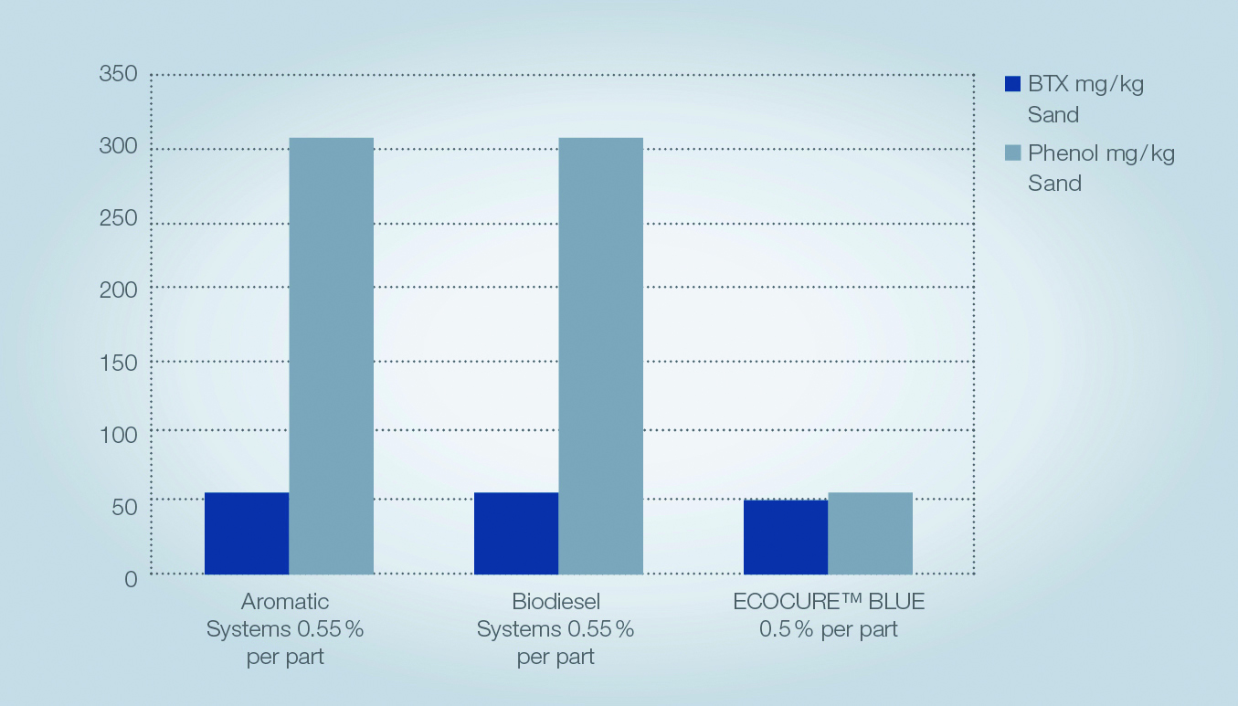 During pouring, cooling and shakeout, there are basically two kinds of emissions: BTX and phenol emissions. The BTX emissions are more likely to stem from the polyurethane pyrolysis than from the solvent package of the binder. Therefore these BTX emissions can only be significantly reduced by reducing the binder quantity and by increasing the efficiency of the binder, as the ECOCURE™ binders do. With less free phenol, the ECOCURE™ BLUE enables the phenol emissions to be drastically reduced during pouring.
